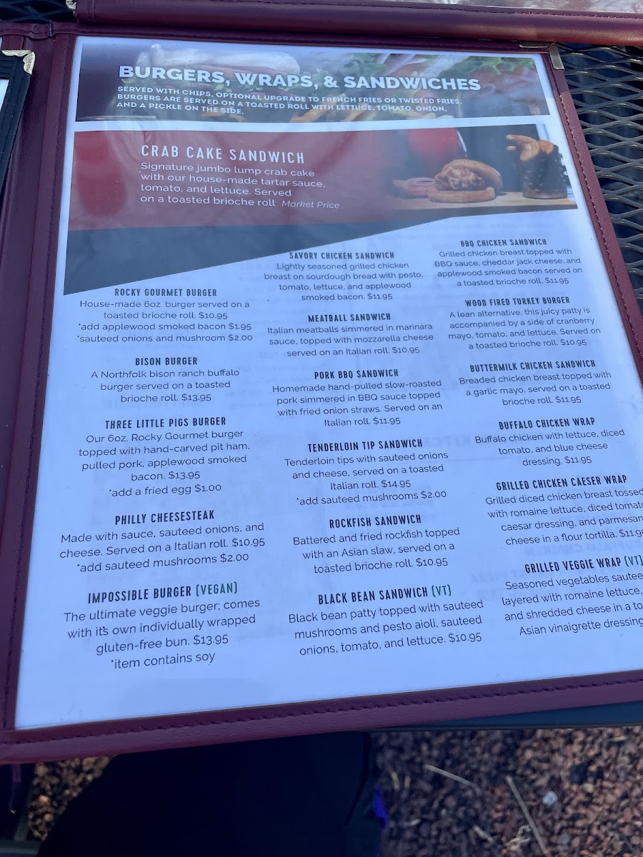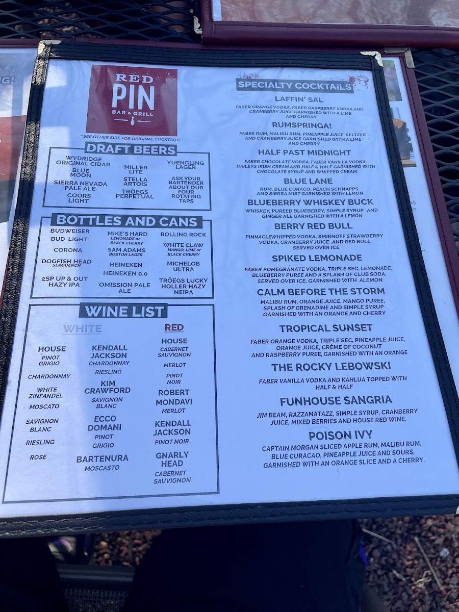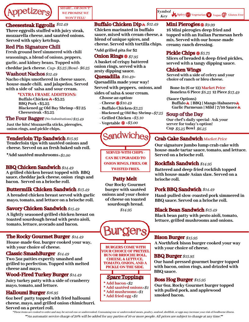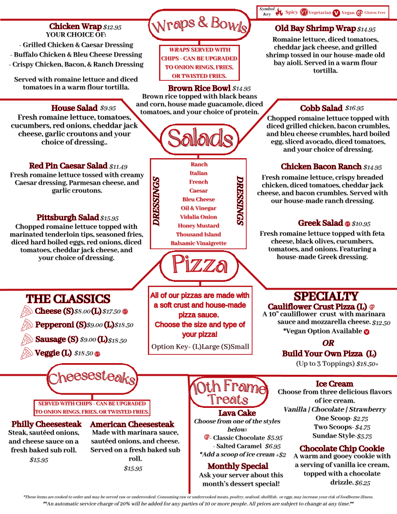 The menu at Red Pin Bar & Grill offers a delightful range of options catering to different tastes and preferences. For sandwiches, you can enjoy choices like the Smoked Chicken Melt, BBQ Chicken Sandwich, and the Signature Crab Cake Sandwich. If you're in the mood for something a bit lighter, the Black Bean Sandwich (VT) is a great vegetarian option. Their appetizers, such as Gouda Bacon Dip and Bone-In Chicken Wings, are perfect for sharing. For those looking for something hearty, the BBQ Burger and Bison Burger provide delicious alternatives to classic beef patties. The menu also features healthy salads like the Chopped Pomegranate Salad and the Chicken Bacon Ranch Salad. For pizza lovers, there's a variety of options, including a 10" Cauliflower Crust Pizza (Gluten-Free) and a Large Veggie Pizza. The wraps and bowls, such as the Buffalo Chicken Wrap and Creamy Chicken Rice Bowl, offer flavorful, easy-to-eat meals. Don’t forget the tempting desserts, including the rich Chocolate Lava Cake and the refreshing Sugar Cookie Cheesecake. For younger diners, the Kids Meal Hot Diggity Dog or Kids Meal Grilled Cheese Sandwich make for perfect choices. With a variety of options and flavors, Red Pin Bar & Grill ensures there’s something for everyone, whether you're grabbing a quick bite or enjoying a full meal.